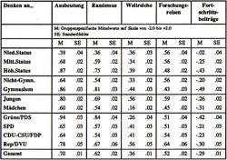 Les stéréotypes anti-colonialistes de caractère à la fois moralisant et conventionnel sont nettement identifiables; (comme on l'a déjà montré en 1990) ils dépassent même largement ce contexte (cf. von Borries et al. 1992, p. 70 et suiv.), mais ne se reproduisent manifestement pas dans les contenus sur l'Europe. De telles inconsistances ne sont pas uniquement le fait des jeunes, mais se retrouvent aussi chez les adultes. On suit les conventions, sans se donner la peine d'analyser. Un exemple qui l'a bien illustré en 1992 est celui de la position adoptée sur le progrès (von Borries et al. 1995, p. 182 et suiv.; p. 38 et suiv.), qui conditionne tout naturellement toutes les perceptions, mais est par ailleurs explicitement contestée.